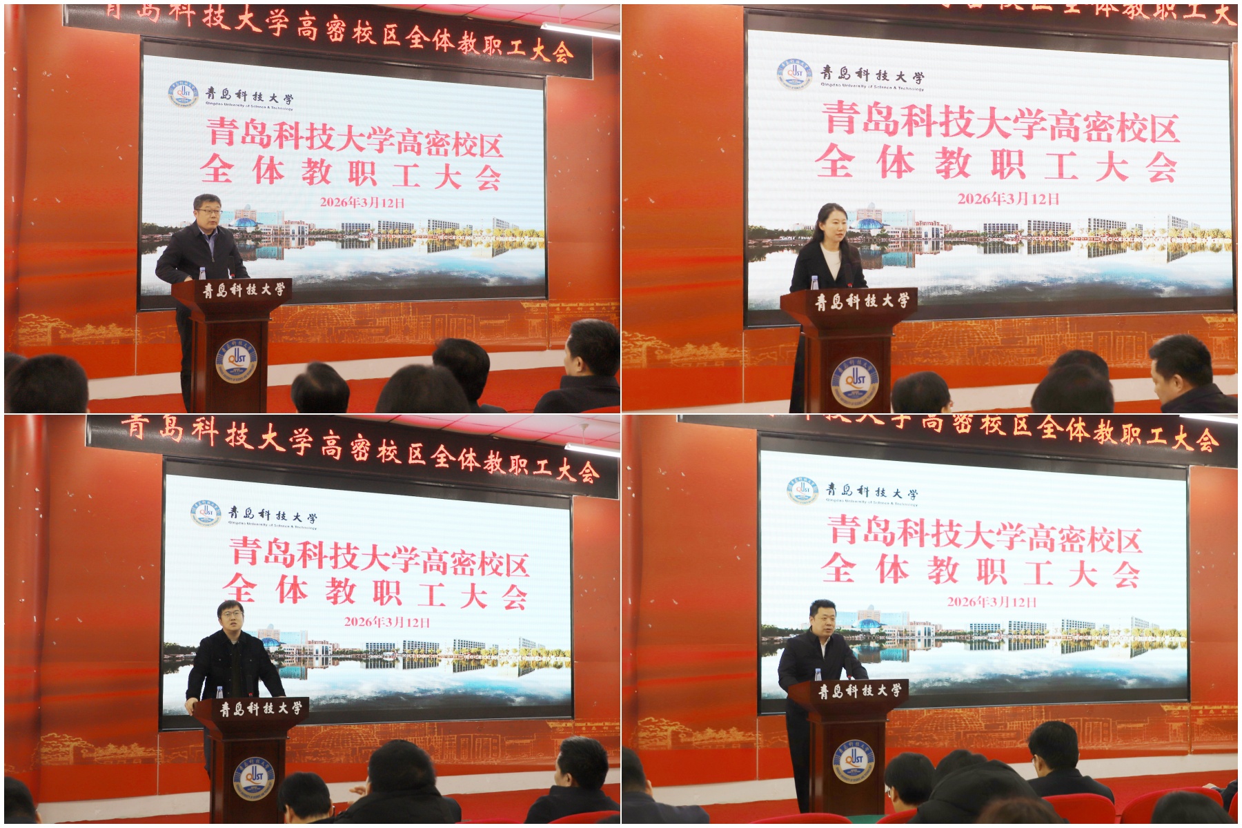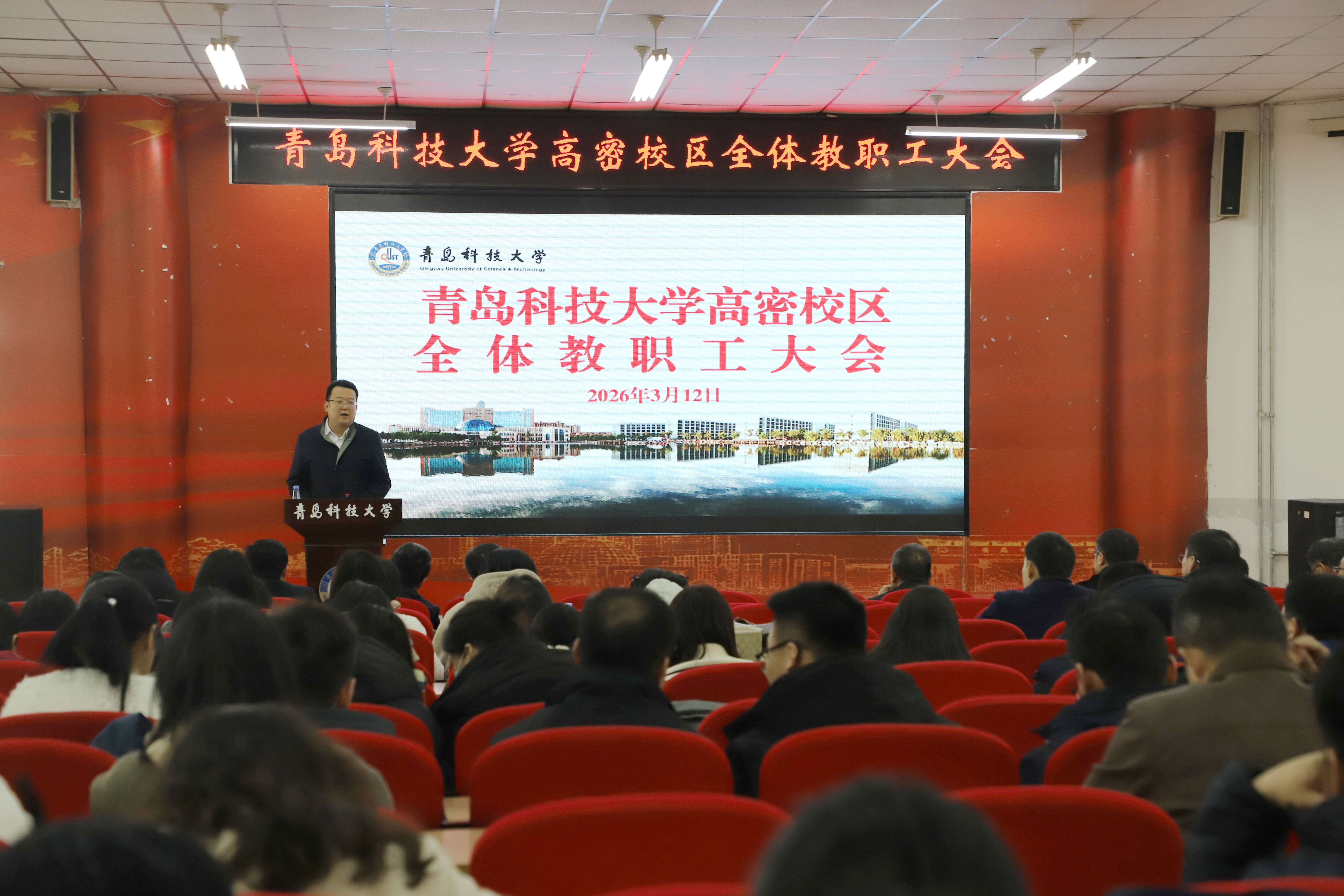 3月12日下午,青岛科技大学高密校区在通德会堂召开全体教职工大会,校区管理办公室主任兼党委书记张壮传达学校2026年工作会议暨全面从严治党工作会议精神,并结合校区实际部署新学期重点工作。校区管理办公室副主任钟鸣主持会议。