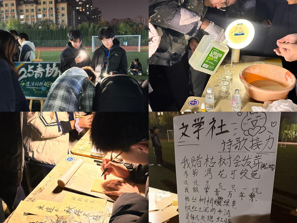 除舞台表演外,活动现场还设置了多个社团展位与互动体验区。同学们可在展位前了解社团特色、参与知识问答、体验书法创作、乐器试玩及手工制作等环节,亲身感受社团活动的魅力。现场还设有趣味打卡与抽奖活动,定制纪念品与社团周边礼品吸引了大量同学踊跃参与,增强了活动的互动性与趣味性。