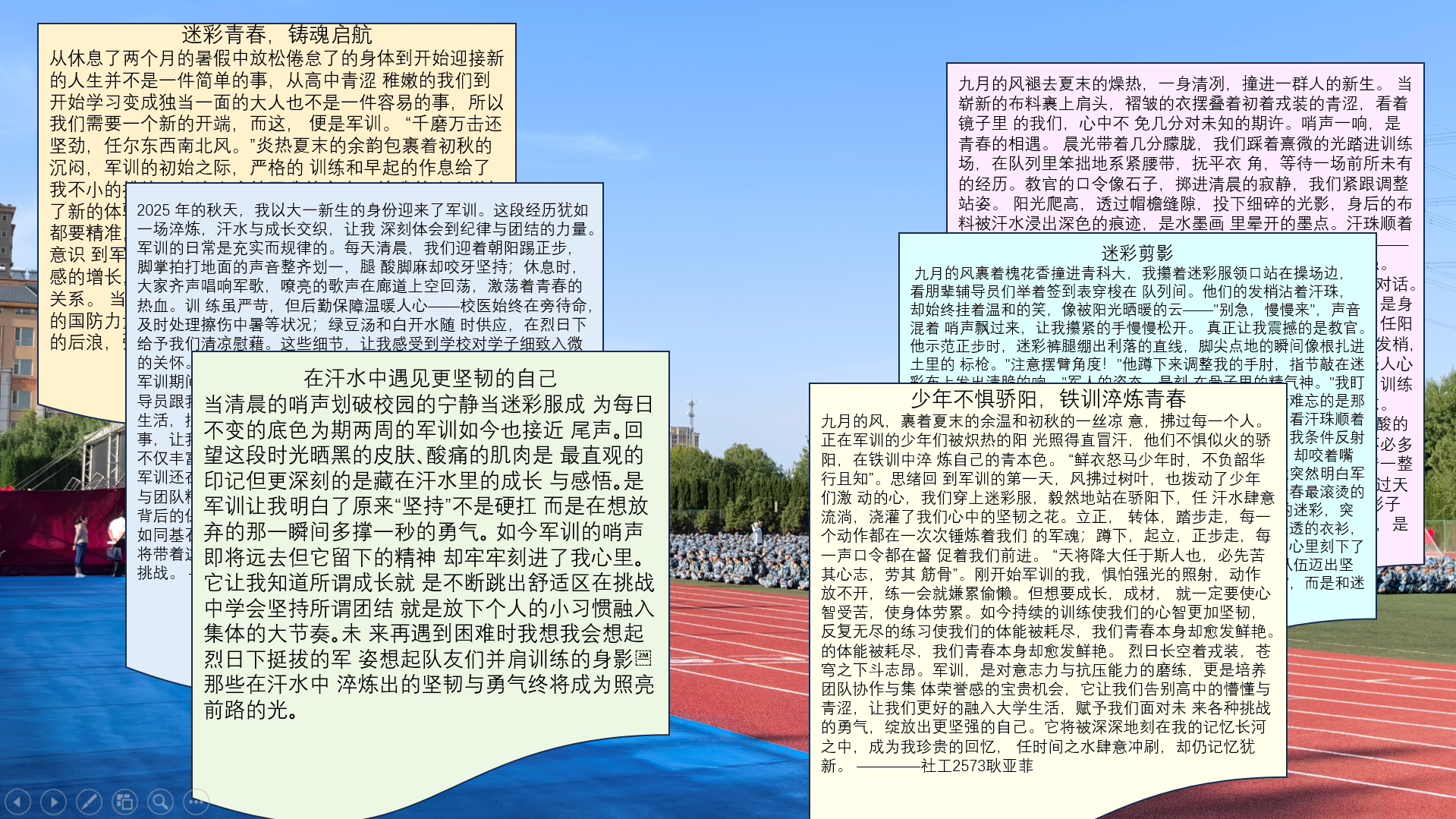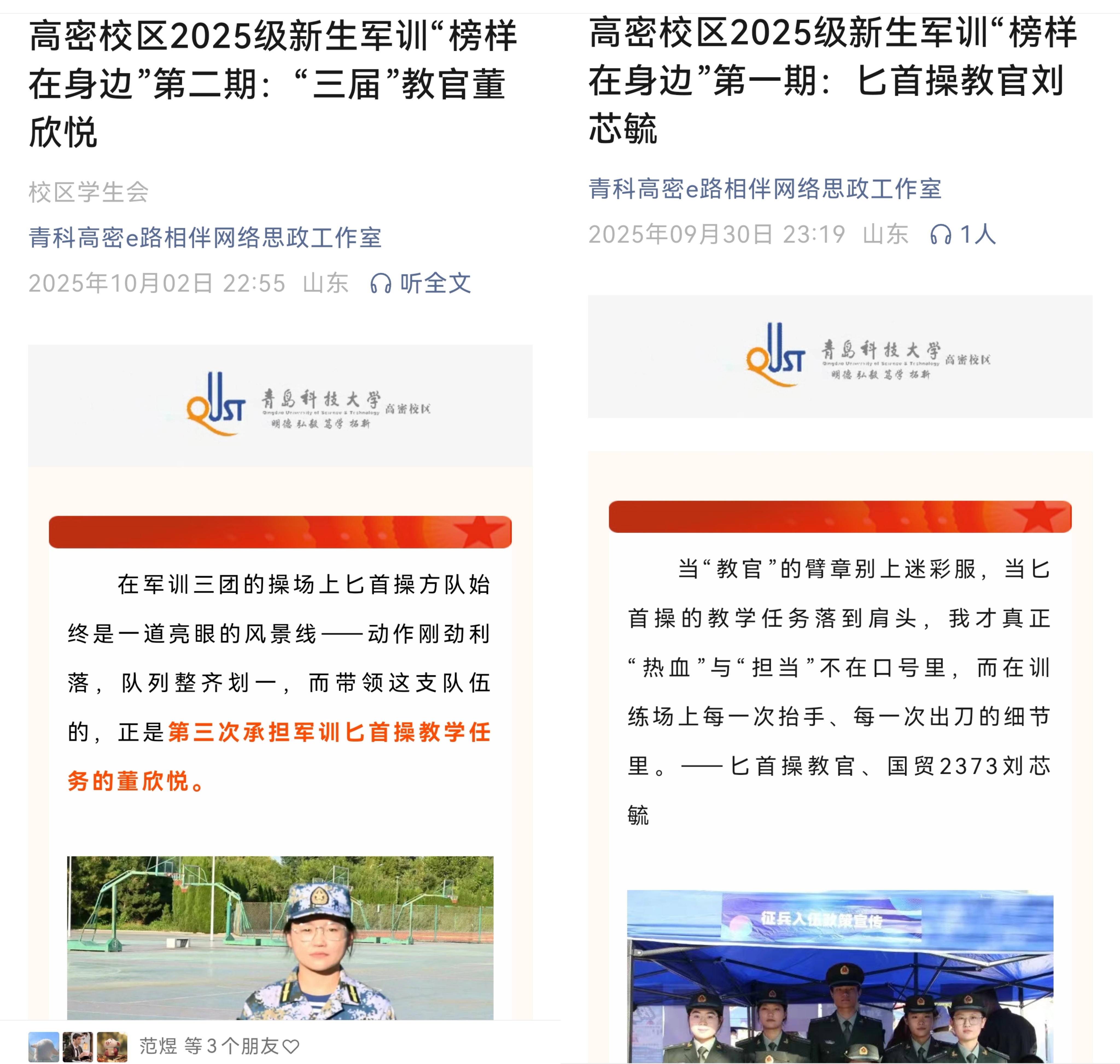 以文育人,笔墨镜头记录迷彩青春。军训期间,校区积极搭建文化创作与典型宣传平台,引导学生以笔墨和镜头记录所见所感、颂扬先进榜样,有效转化和固化军训育人成果,丰富了校园文化建设与思想政治教育资源。作为军训文化育人的重要载体,“迷彩青春,笔下(镜下)生花”作品征集活动吸引众多学生积极参与,创作出了涵盖征文、短视频、摄影、绘画、诗歌等多种形式的精彩作品,既生动记录了军训点滴,也为后续成果展示与精神传承奠定了基础。这些作品生动真挚地反映了学子们的军训体验与成长感悟。经专业评审遴选,优秀作品通过“e路相伴”公众号等平台进行系列展播,成为传递军训正能量、扩大教育影响力的重要载体。同时,校区通过选树“榜样在身边”,一批在训练中刻苦拼搏的训练标兵、在生活中无私奉献的先进个人、以及体现优良作风的感人事迹被深入挖掘和广泛宣传。对这些案例形成了一批具有代表性的教育素材,为后续持续开展思想政治教育提供了生动教材与有力支撑。