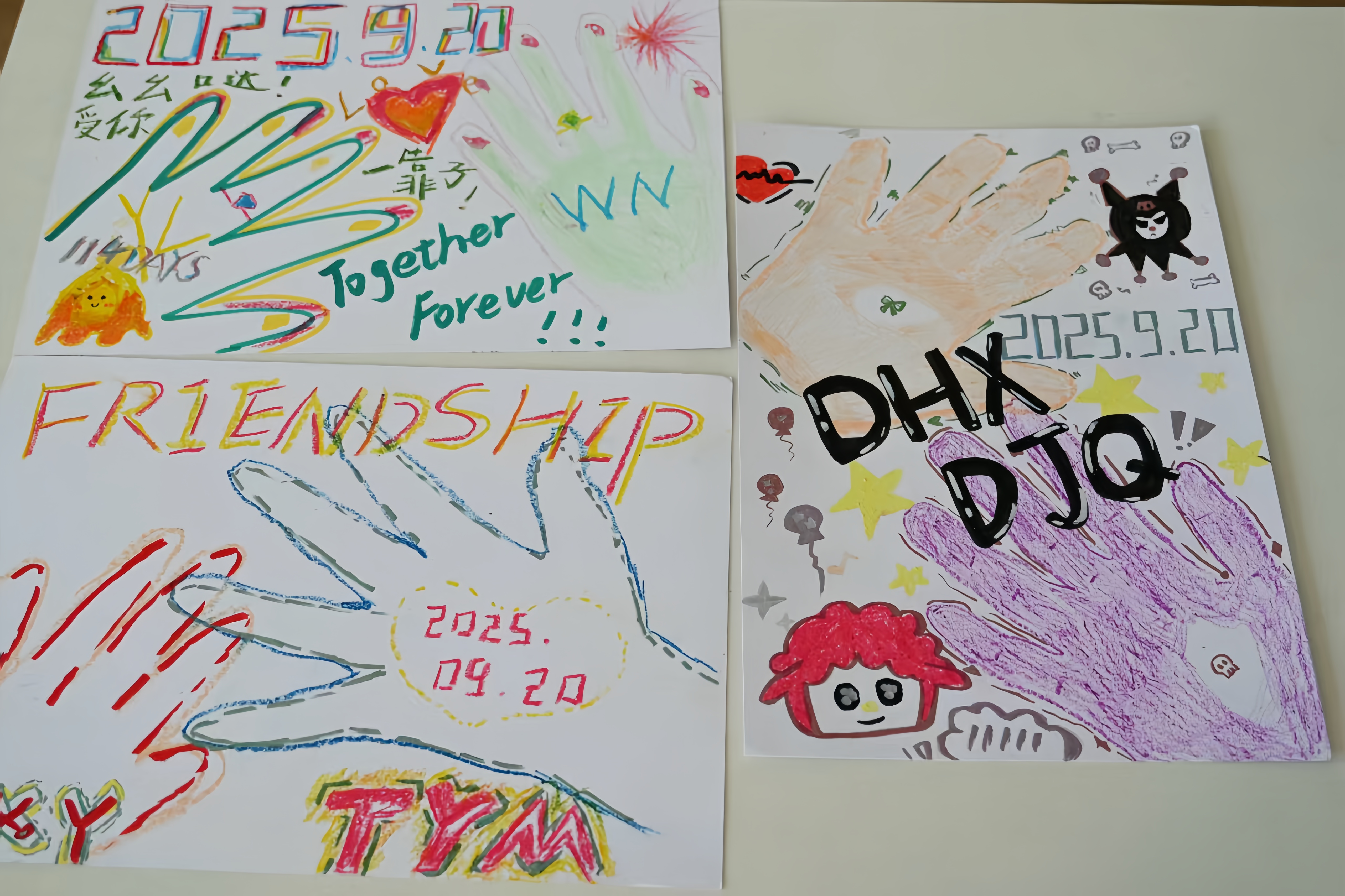“掌印凝情,盲盒传暖”活动则通过非言语的协作方式,着力于信任关系的构建与情感默契的培养。参与者提前准备手写鼓励卡片、趣味故事纸条等“友爱信物”封装成盲盒。活动过程中,小组成员依次在画布上以手掌进行创作装饰、续写故事,全程保持静默以强化非语言沟通与默契配合。绘制结束后,各组围绕作品分享友情故事,并在互换盲盒的环节中,收获来自陌生同学的真挚鼓励,实现了“无声协作”与“情感传递”的双重体验。