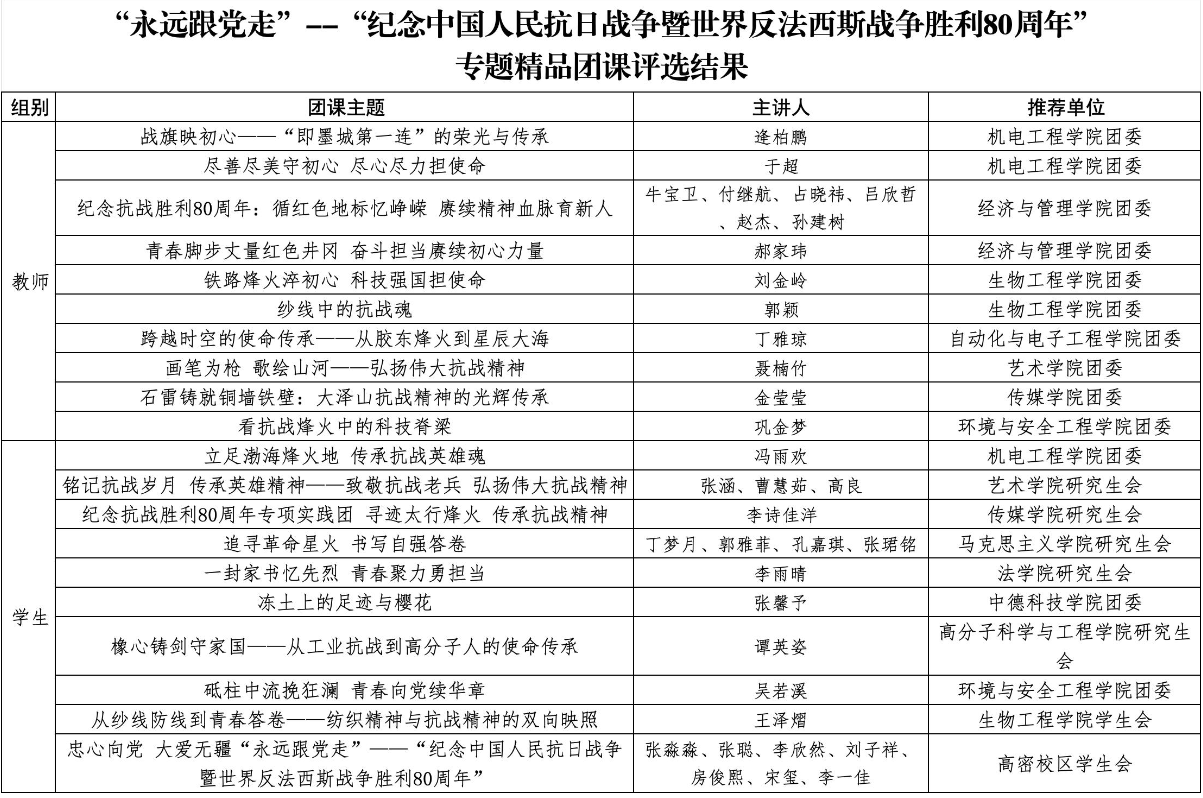 近日,青岛科技大学团委于11月20日正式公布了“永远跟党走”——“纪念中国人民抗日战争暨世界反法西斯战争胜利80周年”专题精品团课评选结果,由高密校区学生会精心筹备并推荐的《忠心向党 大爱无疆“永远跟党走”——“纪念中国人民抗日战争暨世界反法西斯战争胜利80周年”》主题团课成功入选。