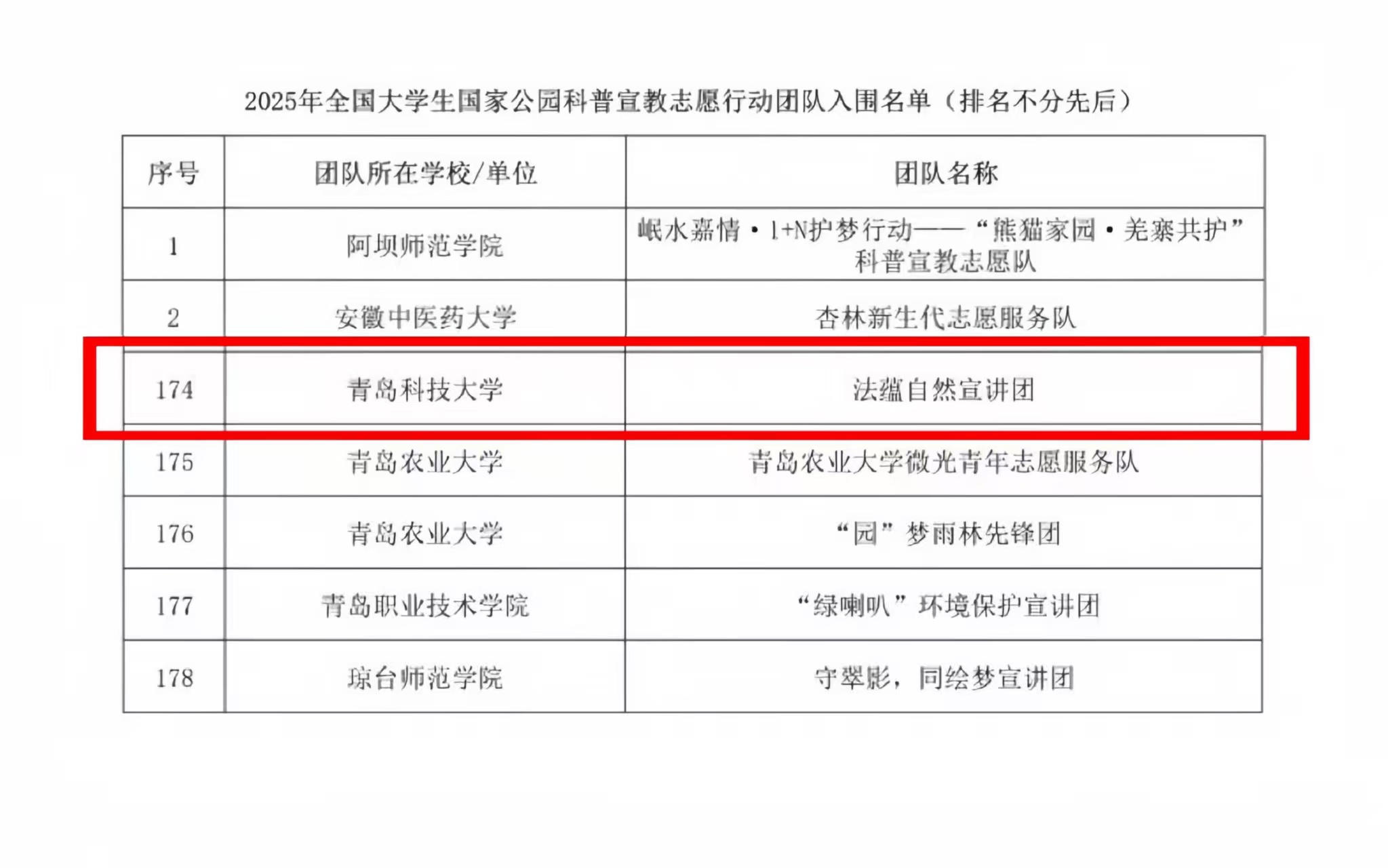 近日,由海南绿岛热带雨林公益基金会、海南省青少年活动中心承办的“走进热带雨林·守护国家公园”2025年全国大学生国家公园科普宣教志愿行动结果公布,青岛科技大学“法蕴自然”宣讲团成功入选。