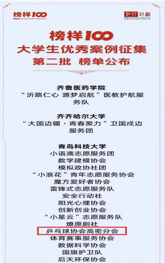 近日,2025年“榜样100”大学生优秀案例榜单正式揭晓,青岛科技大学高密校区乒乓球协会凭借扎实的社团建设成果与丰富的实践成效,从全国376所高校的1320支入围团队中脱颖而出,成功获评“榜样100”优秀大学生社团案例,为学校再添荣誉。