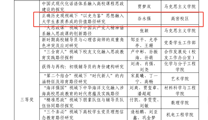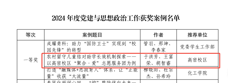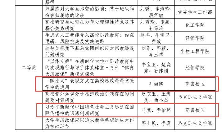 另悉,在学校2024年度党建与思想政治工作优秀论文(案例)评选中,校区推荐的4篇论文脱颖而出获评优秀。于洪芳、王富荣、胡智睿的《农村留守儿童结对助学长效机制探索——以高密校区“聚合·爱”志愿服务团为例》获评优秀案例一等奖。在优秀论文评选中,毛尚卿、马骥的论文分别获二等奖;谷永强的论文获三等奖。
