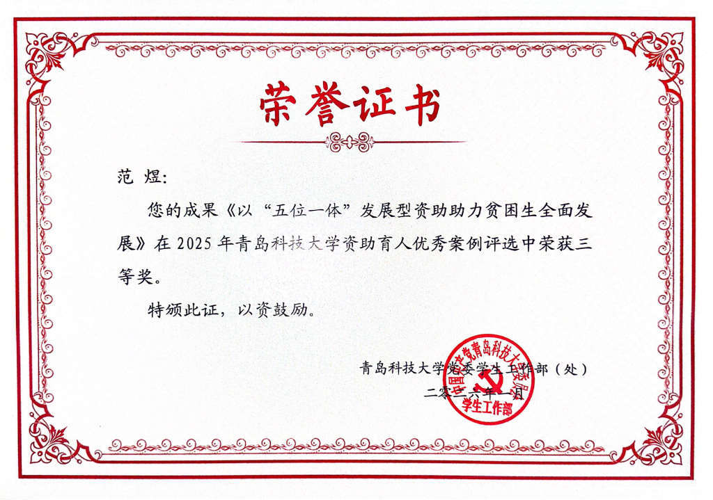 近日,青岛科技大学“资助育人优秀案例”评选落幕,高密校区徐连基、范煜分别荣获个人二等奖、三等奖。