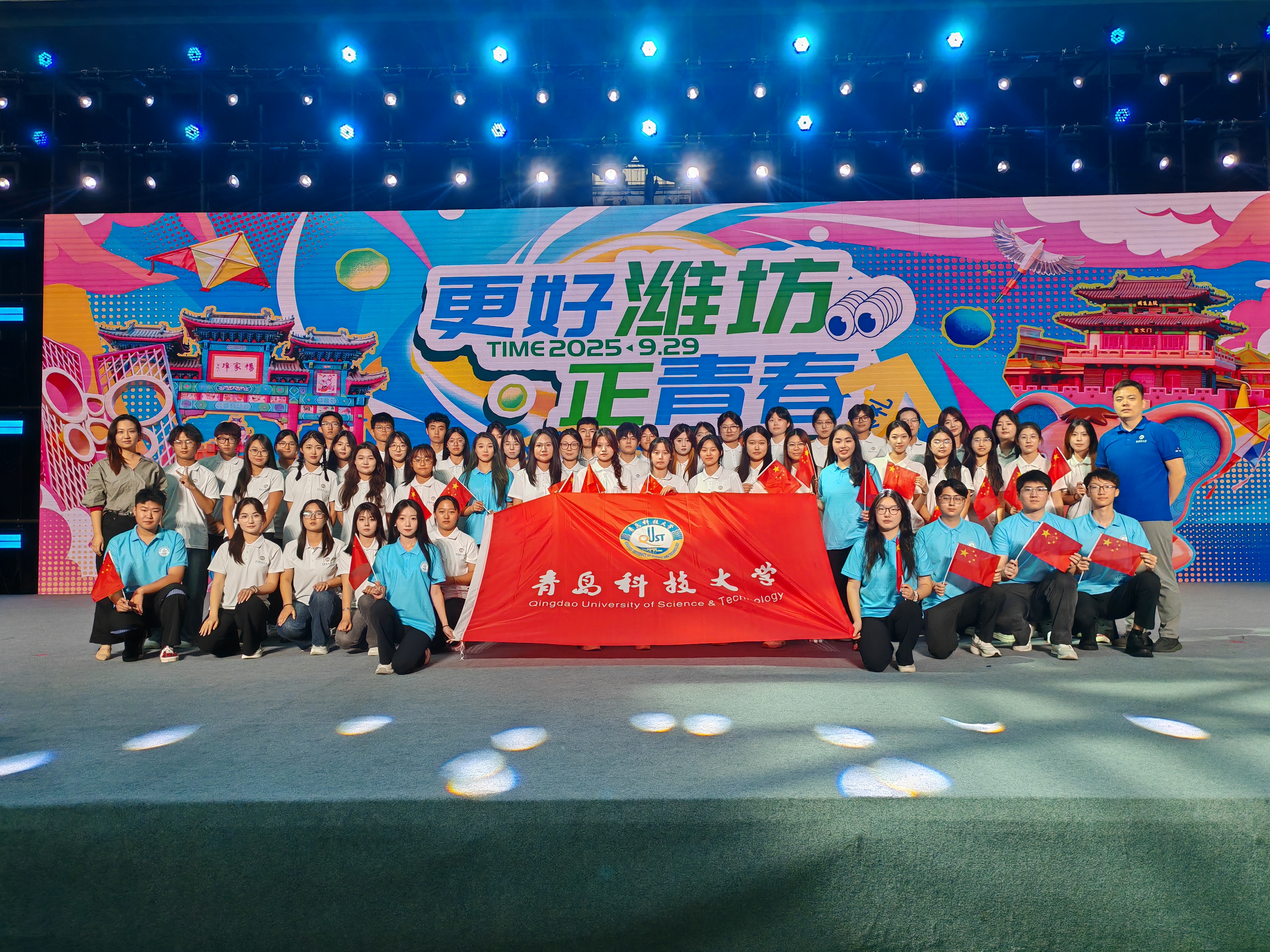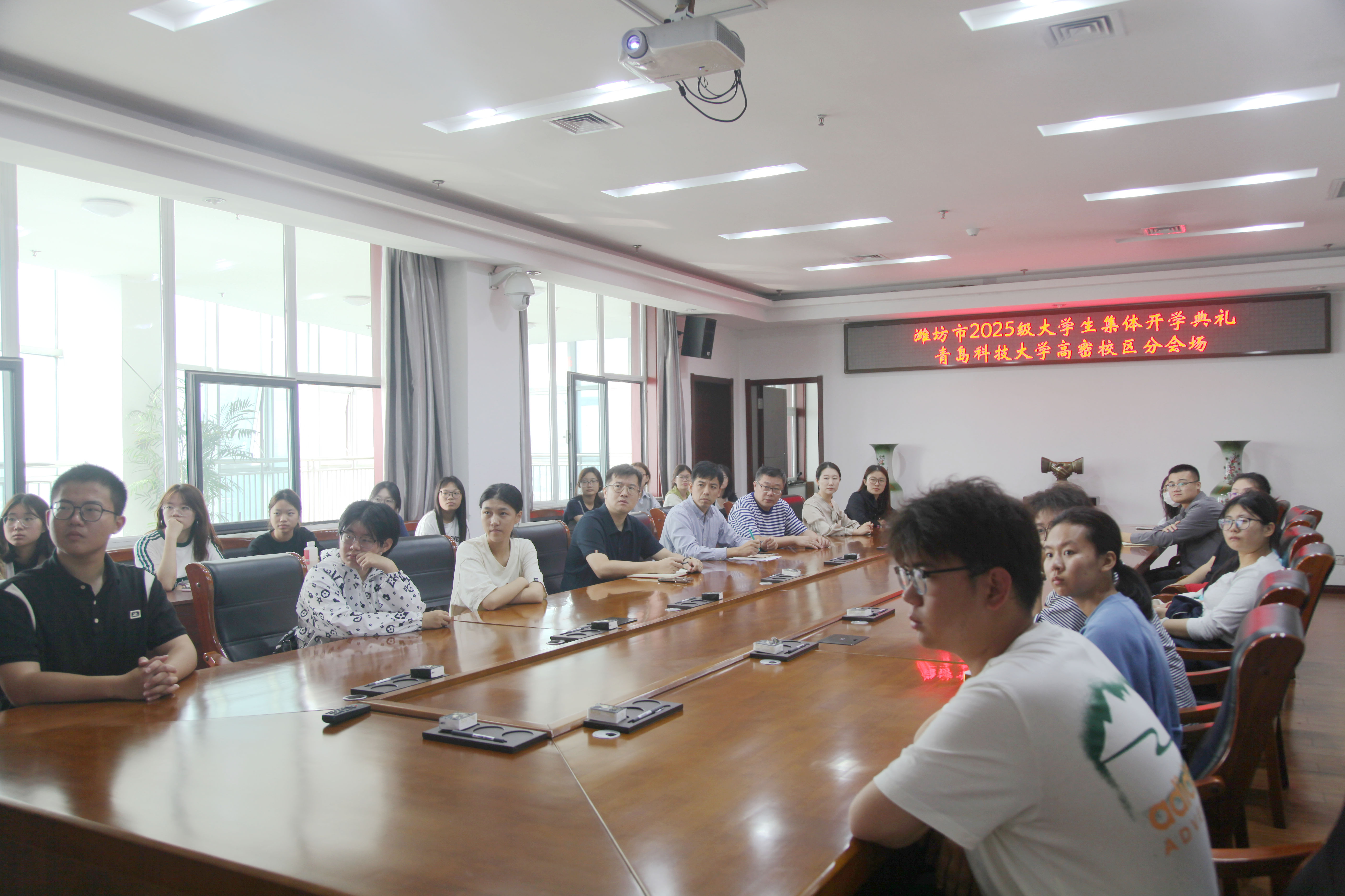 9月29日上午,潍坊市2025级大学生集体开学典礼在潍坊学院体育馆隆重举行。青岛科技大学高密校区管委会常务副主任张壮和校区学生代表56人现场参会。校区同步设立分会场,党委书记马骥、各部门负责人及师生代表齐聚一堂,通过直播视频全程观看典礼盛况。