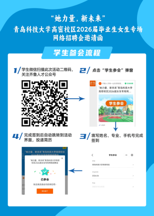 为深入贯彻落实党的二十大四中全会精神及党中央、国务院“稳就业”“保就业”决策部署,全面执行山东省教育厅、山东省人力资源和社会保障厅关于促进高校毕业生更加充分更高质量就业的工作要求,切实维护女毕业生就业权益,为女毕业生提供精准化、专业化就业服务,青岛科技大学高密校区特策划举办“她力量新未来”2026届毕业生女生专场网络招聘会。我们期待通过此次活动,为校区广大女学子开启一扇通往职业梦想的窗口,助力她们在建设新时代社会主义现代化强省的宏伟征程中,贡献独特的“她力量”,书写绚丽的“新未来”。