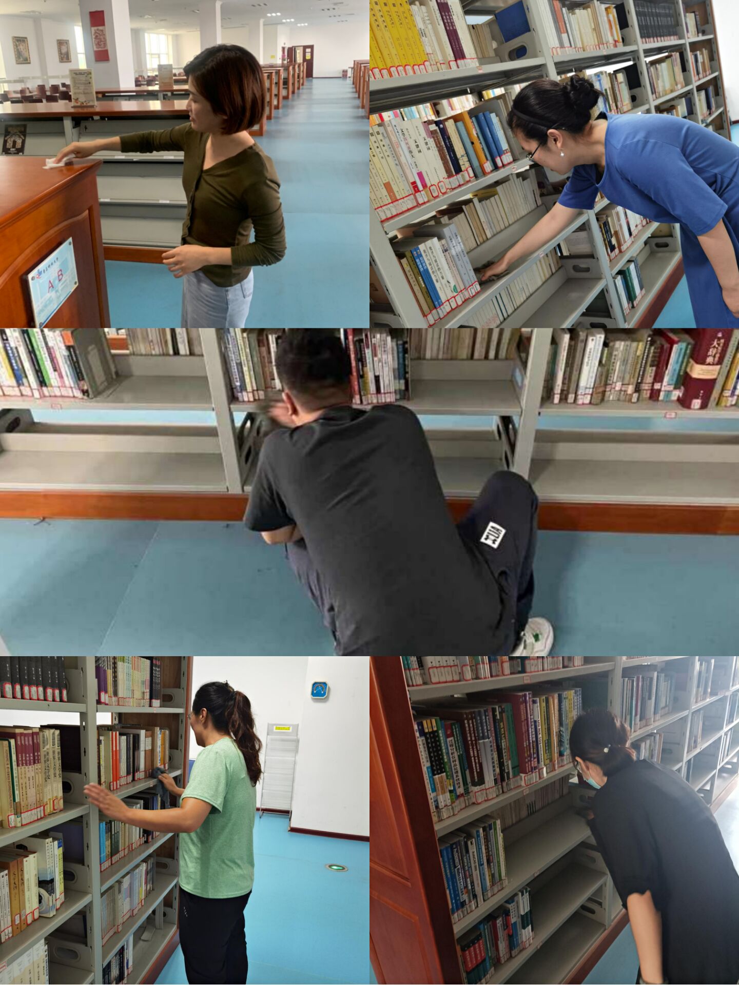 根据库室分布,本次主题活动分为六组,由党员同志牵头,非党员同志积极配合,大家领取打扫工具,明确责任区,认真地对图书进行归类整理并将积灰的书架“改造”得整洁有序。对图书馆的所有死角都被进行了全面、彻底的清理。经过大家集体奋战,图书馆的面貌焕然一新。