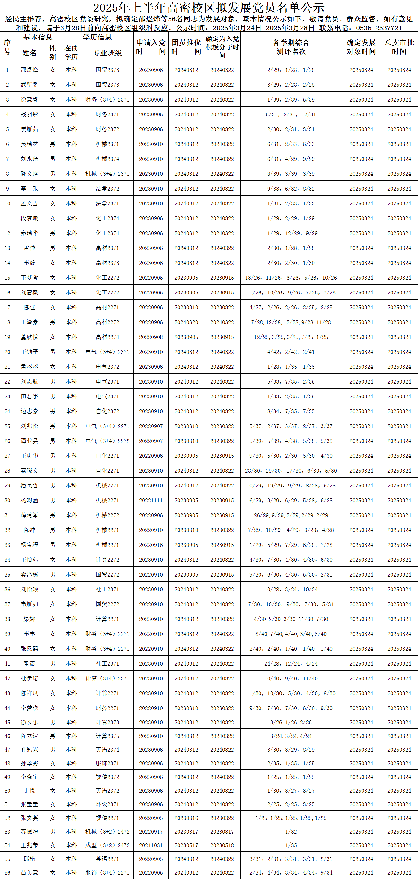 2025年上半年高密校区拟发展党员名单公示